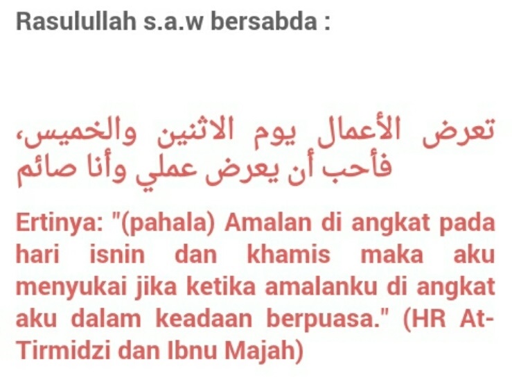 Dalil dan fadhilat puasa juga disertakan. Daripada abu qatadah ra bahawa rasulullah saw ditanya mengenai puasa pada hari isnin. Kelebihan berpuasa isnin & khamis.